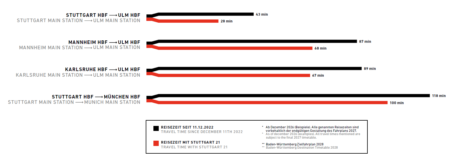 Die rund 60 Kilometer lange Schnellfahrstrecke Wendlingen–Ulm ermöglicht einen schnellen und komfortablen Weg über die Schwäbische Alb, über die Hälfte der Strecke verläuft in Tunneln. Es ergeben sich zahlreiche Veränderungen und Verbesserungen für Stuttgart und Baden-Württemberg: Rund 75 Prozent der Baden-Württemberger wohnen in Landkreisen, die durch das Bahnprojekt von kürzeren Reisezeiten und mehr Direktverbindungen profitieren. Darüber hinaus ist das Bahnprojekt Stuttgart–Ulm Teil des wichtigen europäischen Fernverkehrskorridors Paris–Bratislava, der zu einer Hochgeschwindigkeitstrasse ausgebaut wird.